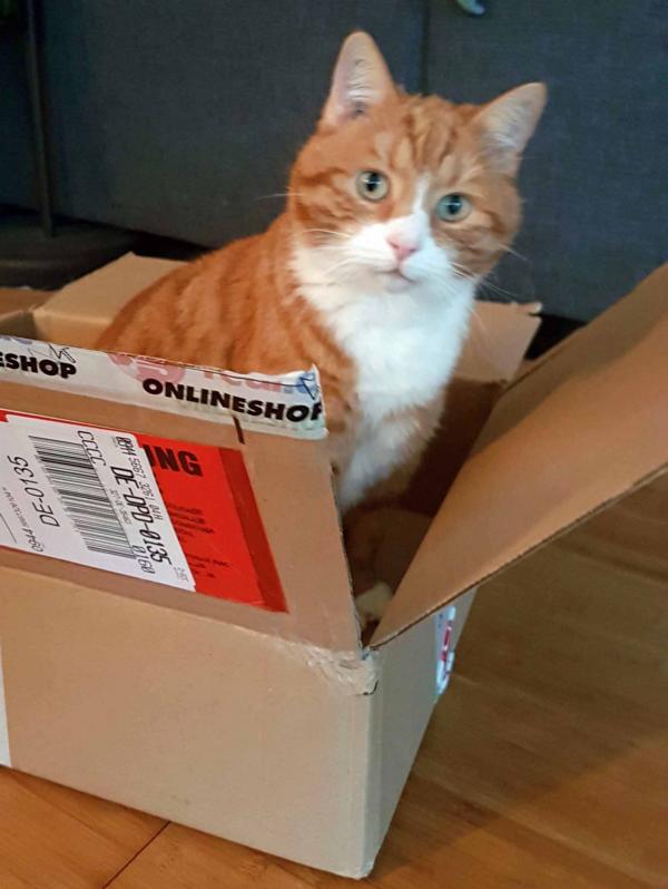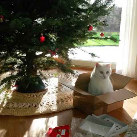 Große Geschenke für eure Katzen müssen übrigens gar nicht sein: meist machen schon all die übrig gebliebenen Kartons und Geschenkpapiere die Miezen glücklich!