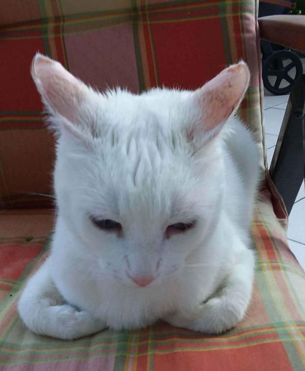 Meine weiße Prinzessin kam vor einigen Jahren aus Spanien zu mir, damals mit völlig verbrannten Ohren. Durch diesen extremen Sonnenbrand wächst auf diesen Katzenohren nun kein Fell mehr, Freigang ist nur mit 50-er Sonnencreme gestattet. Zum Glück ist Blanca eine sehr tolerante Katze, die das Eincremen geduldig über sich ergehen lässt.